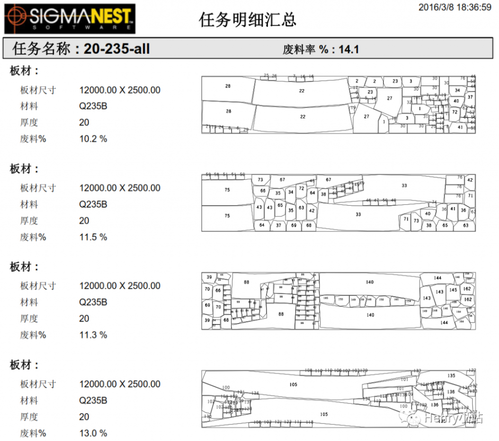 利用SigmaNEST合并订单的方式在国内实际生产中也在不断的应用,比如下图客户从设计模型到下料加工,利用分段合并排版,提高了利用率,减少了余料的产生,适应产品的安装周期,并便于现场分拣调配。