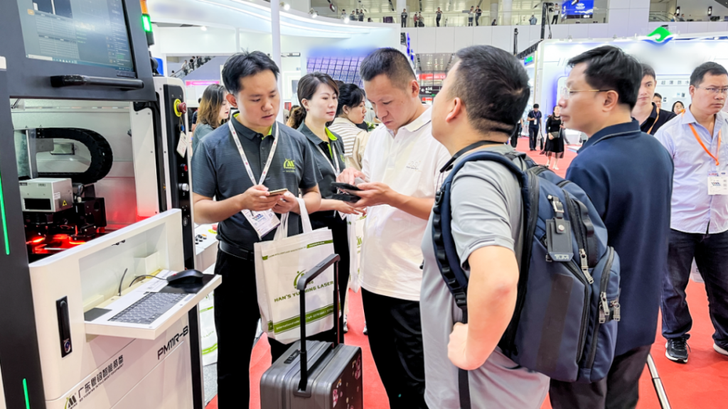在电子智造领域,粤铭激光集团已实现“激光+视觉+自动化+机器人”全方位产品矩阵,涵盖激光开封、激光雕码、激光分板、激光打标、激光除胶、激光去氧化层等智能解决方案。相继推出了PCB专用激光雕码机系列、精密激光分板机系列、激光芯片开封机系列等高性能装备和技术,实现了与SMT产线、生产MES系统的无缝对接,推动电子产品的自动化生产进程,大幅提高了生产线的柔性和效率,在确保加工品质的情况下,更大程度地释放产能。本次展会现场众多重量级机型的精彩亮相,吸引了大批行业客户的热烈关注,收获海量关注度。
