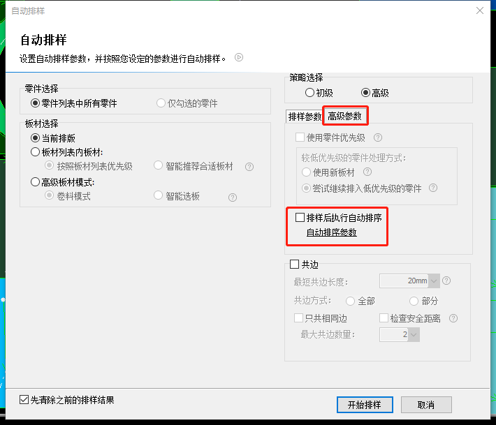 自动排样高级参数下,新增“排样后执行自动排序”勾选项。勾选后则会在排样完成时执行一次自动排序,排序参数调用当前,也可从此链接进入修改,提高了排样的准确性和效率。