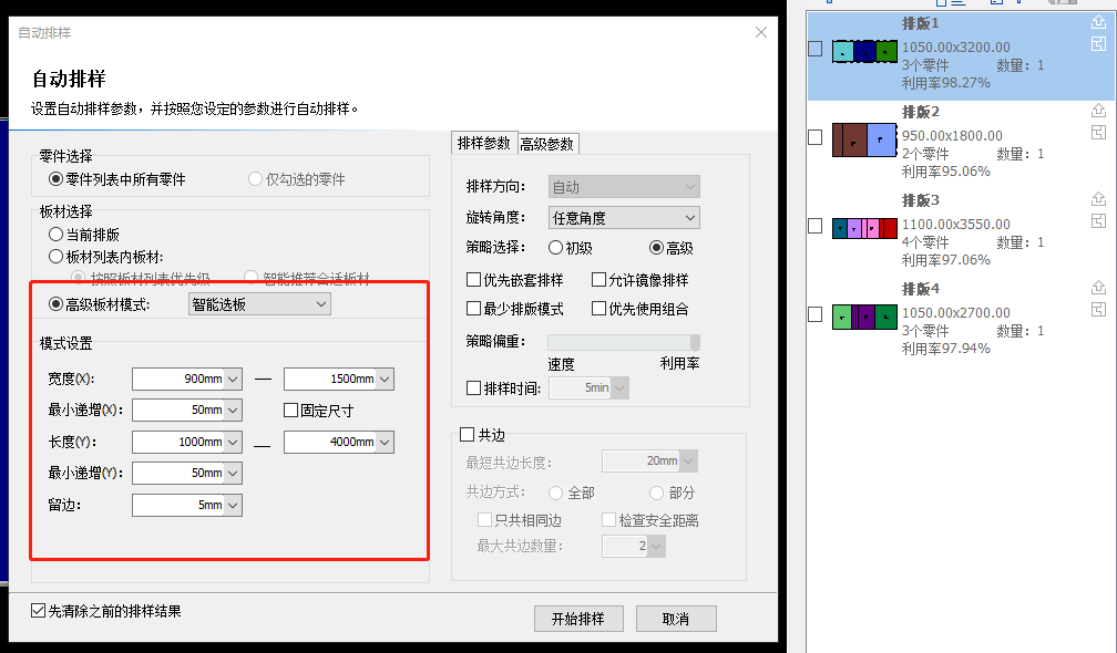 智能选板模式下,输入开板的长宽上下限和最小递增值,软件将智能匹配该区间内所有板材,并挑选出利用率最高的板材进行自动排样。