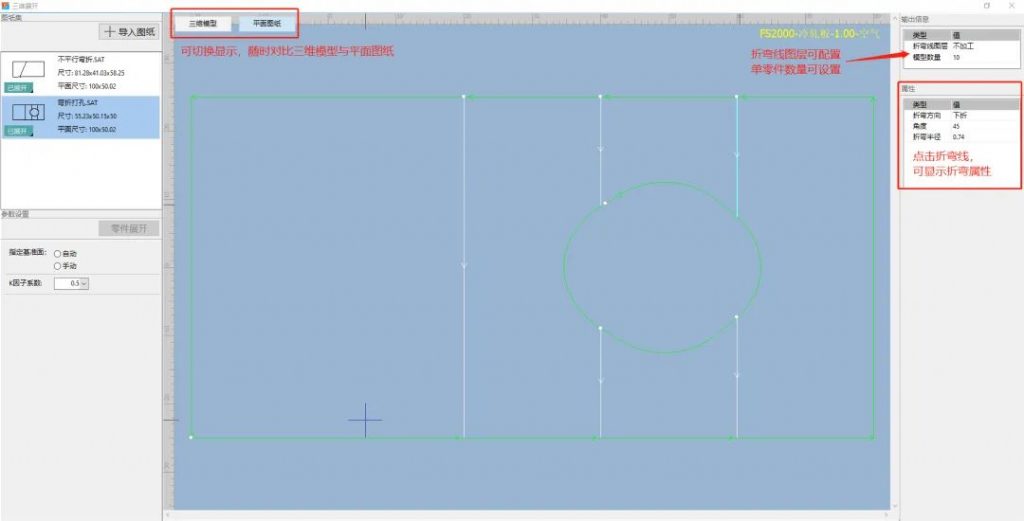 点击展开的平面图纸,右侧输出信息可以配置折弯线图层,也可以设置零件数量。