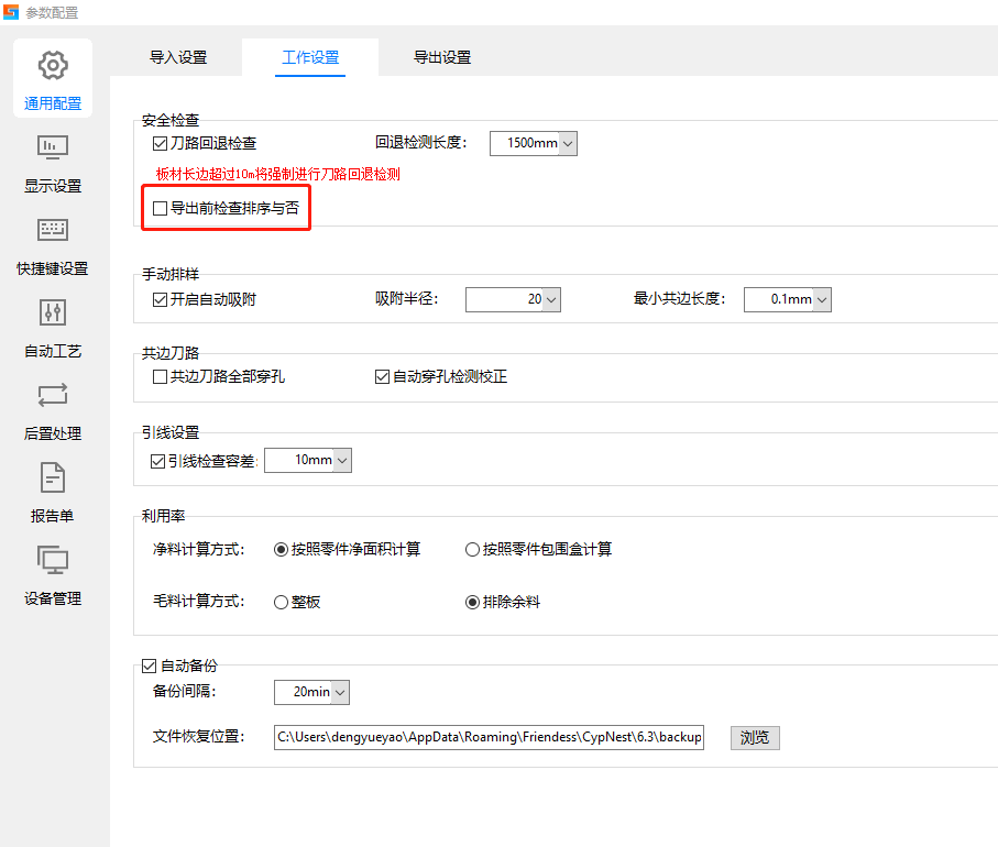 在安全检查模块新增“导出前检查排序与否”复选框,勾选该选项,可以在导出加工文件前进行检测,防止遗漏排序步骤。