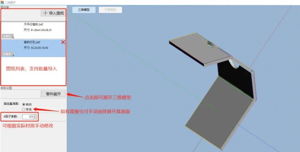 具体操作:主界面点击“添加三维展开”,可批量导入sat格式图纸进行展开处理,将得到展开后的平面零件。