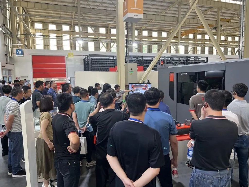 交流会后,与会代表们共同实地参观了百超自动化能力中心。百超的产品专家团队向大家展示了多款新品及其广泛的应用领域,其中就有20kW激光功率的进口激光切割机ByStar Fiber、智能激光切割机BySmart Fiber、功率高达30kW的大幅面激光切割机ByCut Smart以及高性价比的激光切割机ByCut Eco等。同时,还展示了可切割20-220mm管材和开放式型材的激光切管机ByTube Smart,以及高端折弯机代表Xpert Pro和高速灵活的数控折弯机ByBend Smart。其中激光自动上下料系统ByTrans和激光多列料库系统ByStore系列产品引起了大家的广泛兴趣。