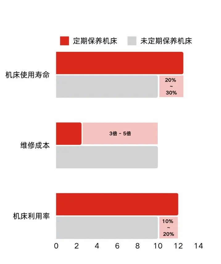 根据制造业技术研究所(MIRI)的数据,机床因缺乏定期保养而导致的紧急维修平均成本是定期保养的 3-5 倍。定期保养可以降低维修成本,节约企业的维护经费。