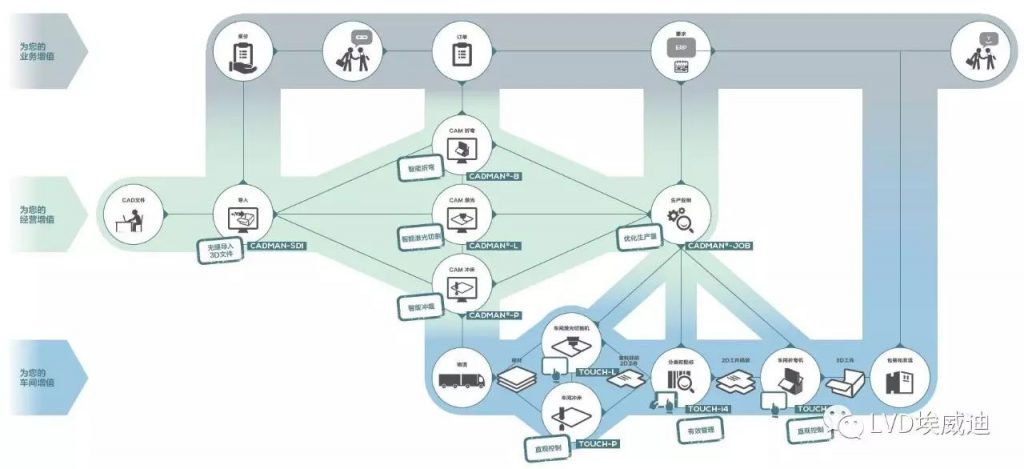 早在德国提出工业4.0之前,LVD就已开始着手对机床之间信息沟通系统的构建,相继开发了折弯、激光、冲床各自的数控系统及离线编程软件,同时开发了CADMAN@-OEE 和CADMAN@-JOB系列集成软件,组成了如今规模庞大的CADMAN@-SUITE软件套件