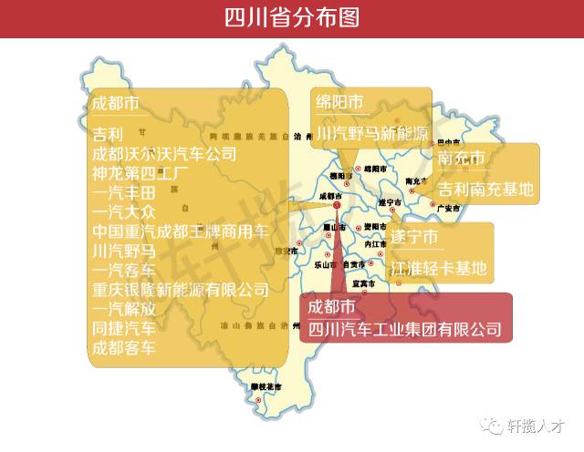 从这张分布图中可以看出,四川的车企生产制造中心主要集中在成都这一块,成都的汽车产业主要集中在龙泉驿那边,谈到成都基地的重要性,一汽大众汽车有限公司总经理安铁成曾经说过:“成都基地是一汽大众继长春之后的第二个生产基地,它的建成对于一汽大众来说,其意义不仅仅是产能的增加,更具有在中国西部区域的战略性作用。”