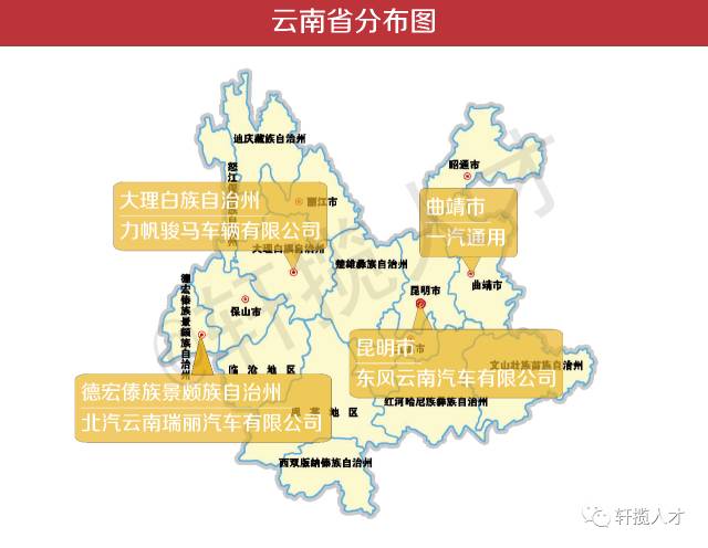 由图可见,云南的汽车主机厂少之又少,全部是以生产制造为中心的,主要原因在于云南位于中国西南的边陲,资源供给以及交通供给等条件都有所不便,除了云南当地人和邻居省市,绝大多数员工,特别是设计研发类人才不会把云南作为自己工作地的首选。