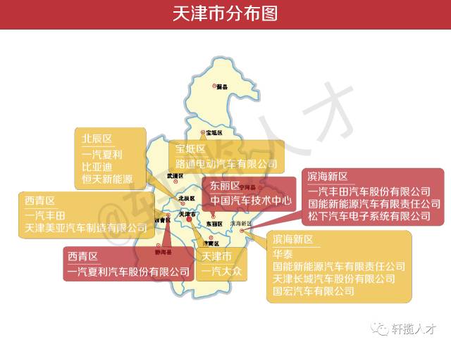 天津的新能源发展较广,新能源汽车企业分布较多,例如比亚迪。生产制造和设计研发中心算是五五开,分布较为平均。