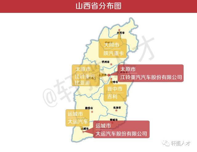 可见山西的主机厂分布也较少,主要是由于这些地区在地理位置上都比较偏远,经济发展较落后些,因此分布的车企也较少,但可以看到这边有新能源汽车企业,例如比亚迪。