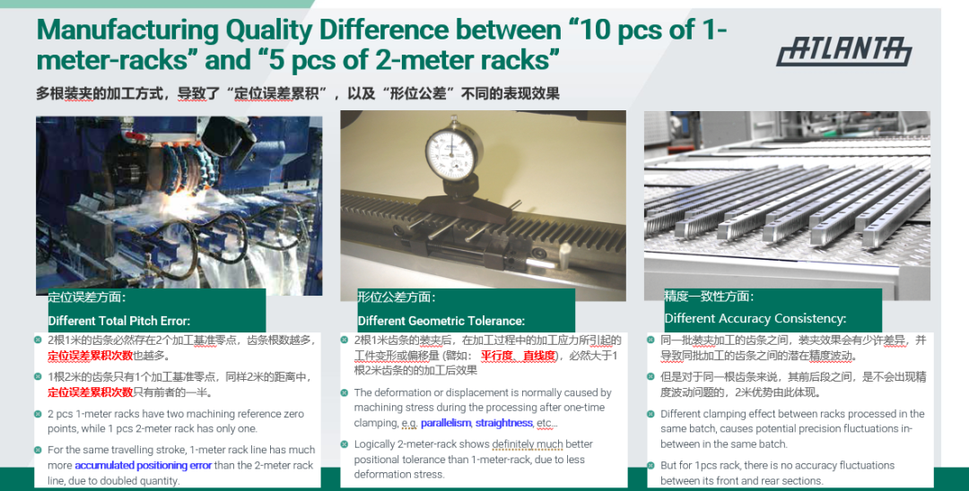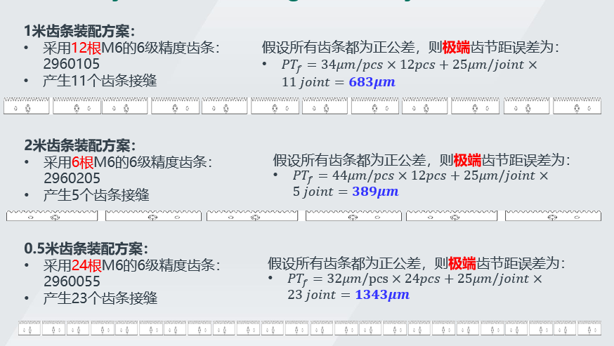 不仅如此,当我们考虑到每根齿条之间的接缝也会产生大约±25μm公差时,2米齿条的优势就更加明显了。