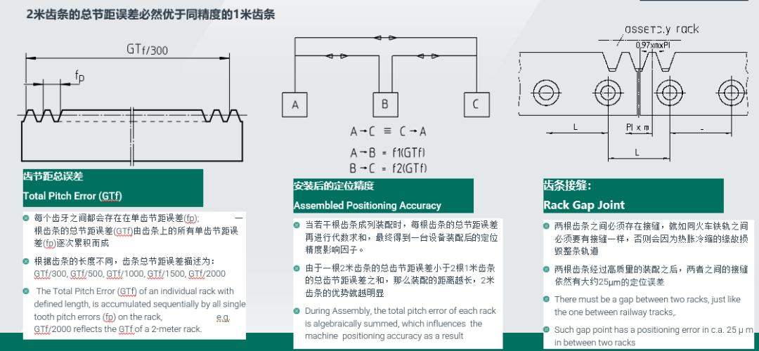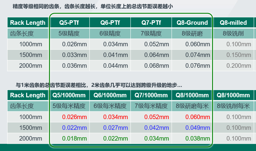 • 一根1米长度的6级精度齿条的齿节距误差在±34μm/1000mm