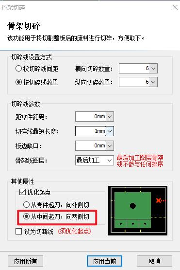 为解决从板内起刀,钻孔容易打伤零件;留零件间距,下料时可能断不开;从板边缘起刀,若板材不是标准矩形,可能下刀处实际没有板材,容易撞头等问题,新版本支持从骨架线中间向两端切割,优化骨架线起刀位置。