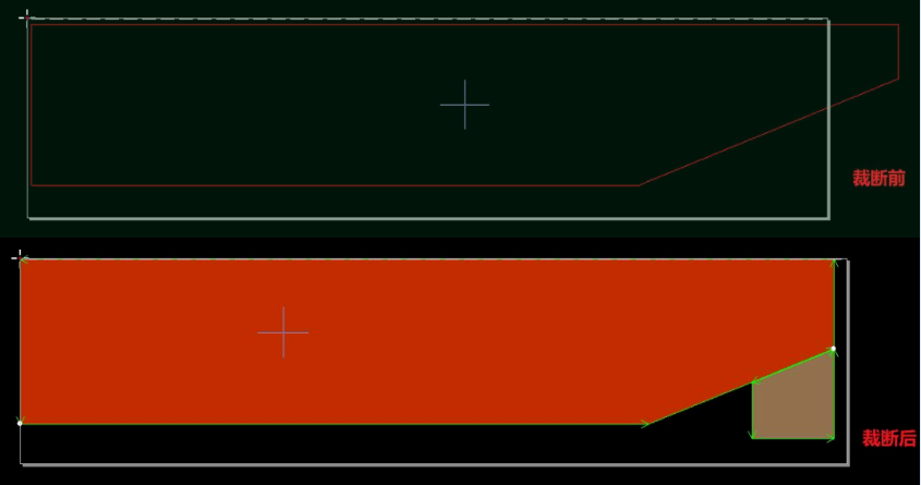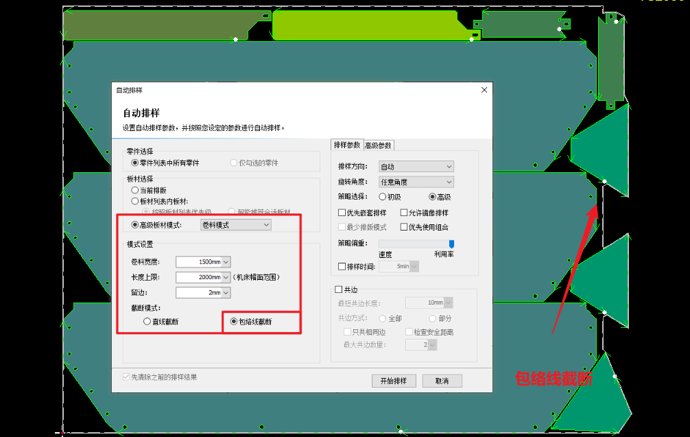 针对使用卷料加工的用户,自动排样时可以选择“卷料模式”。卷料模式下,不限制卷料长度,输入卷料宽度和机床幅面,待排零件全部排入为止。排样后将根据输入的机床幅面,在合理范围内自行分板,切割系统读取后将按照排样结果分段送料。截断模式分为直线截断包络线截断,效果如下图所示,需要切割系统配合完成(请先核对切割系统是否支持)。无论选择哪种截断模式,最后一张排版末端将以直线截断。