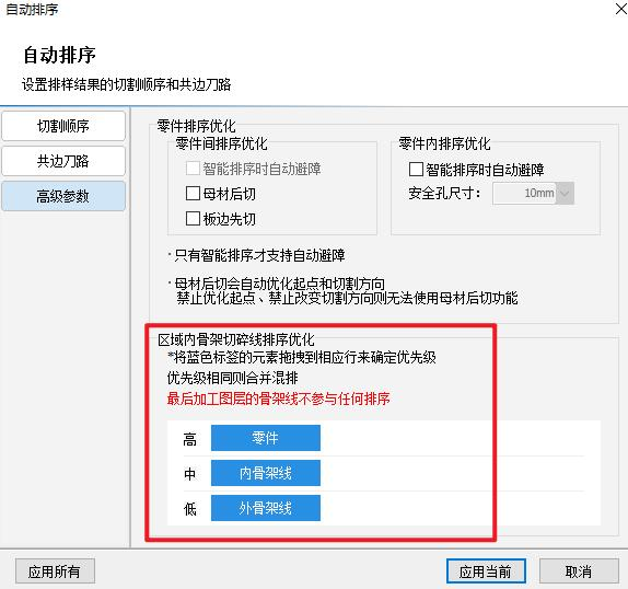将某个区域的零件和切碎线划为一组来排序,那么每次切割完一组都可以将板材的应力释放一部分,可以有效改善骨架翘起问题。同时,支持设置零件内骨架线外骨架线的排序优先级。(直接拖动即可)