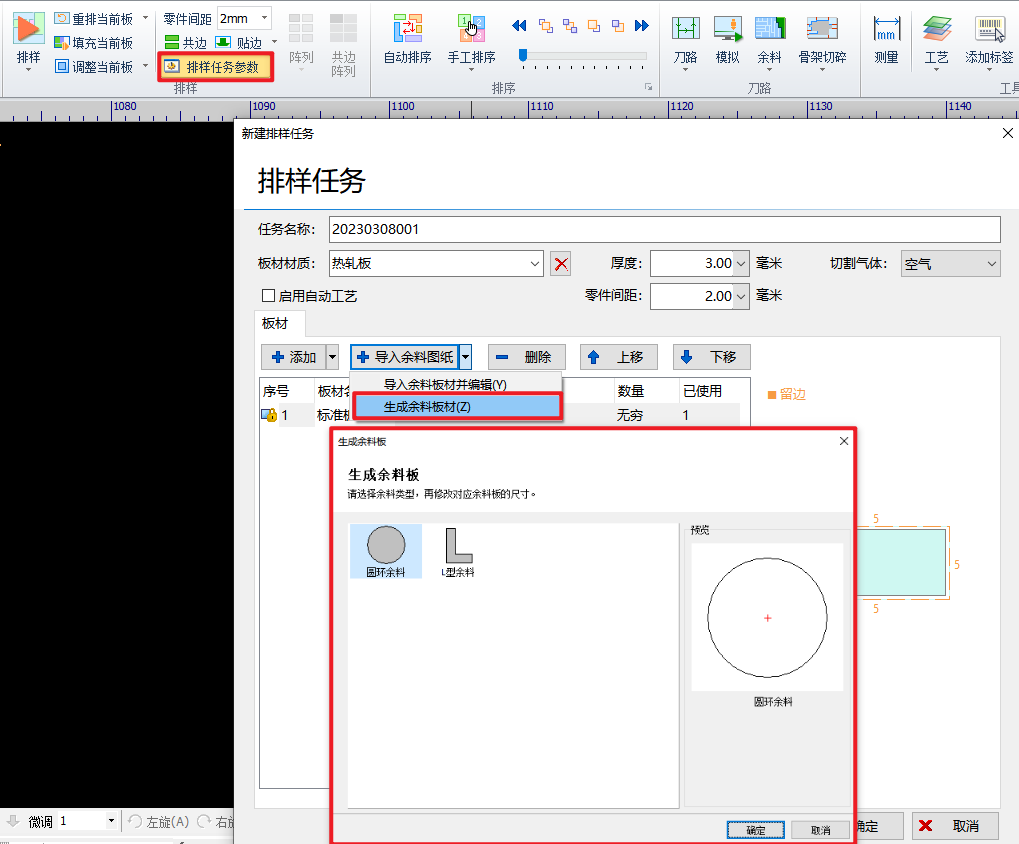 在排样任务参数界面,点击“导入余料图纸”旁下拉三角号,选择“生成余料板材”选项,可以快捷生成L型圆形(圆环)余料板材。