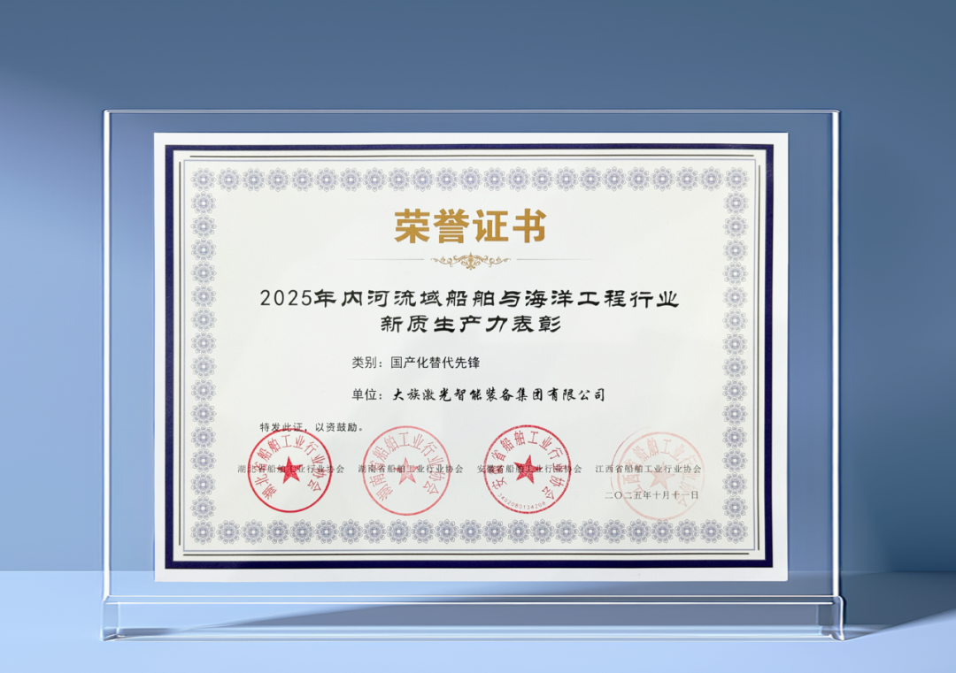 国产化替代,再添先锋力量!近日,在武汉举办的“国际船舶工业技术与海工装备展览会”上,大族激光智能装备集团于同期召开的“2025内河船舶绿色智造发展论坛”中,荣膺大会授予的“内河流域船舶与海洋工程行业新质生产力表彰——国产化替代先锋”称号,成为船舶制造国产化替代进程中的一股重要力量。