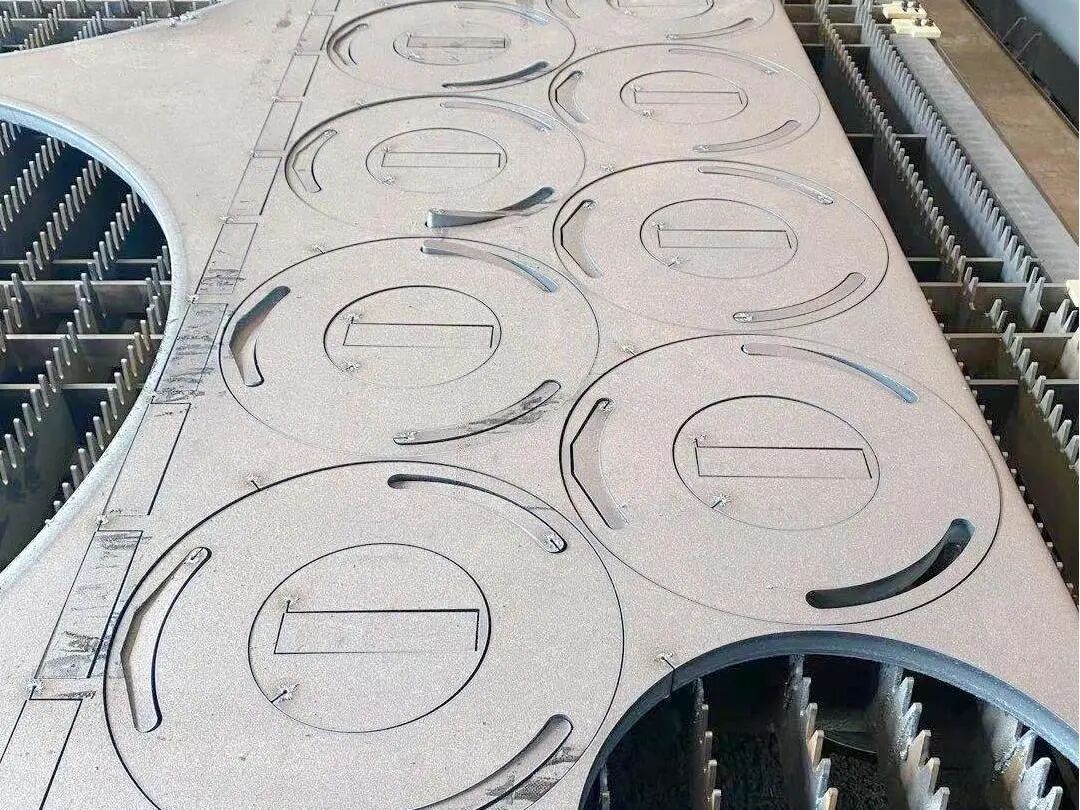 该系列设备长度可达110米以上、宽度可达7米以上,超大型加工幅面,可单次完成船舶甲板等巨型工件加工,减少拼接,效率提升50%;其采用高稳定性纯板焊线轨基座与优质铝横梁,结合弹性自适应与消隙技术,确保传动精准、运行平稳;同时,搭载智能A/B双摆动轴坡口机构,支持±45°内任意角度切割,保障坡口质量与构件强度;并配备随动式除尘系统,实现绿色环保生产。