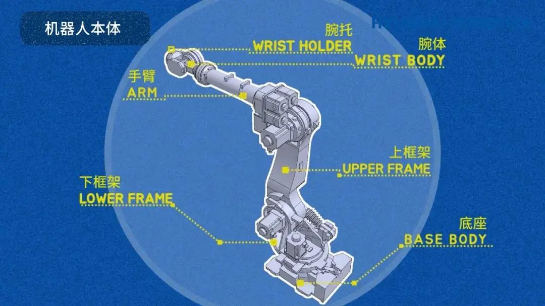 先来说下机器人的本体部分。工业机器人是仿照人的手臂来进行设计的。我们以现代机器人HS220型号为例,从外观来看,主要有底座、下框架、上框架、手臂、腕体、腕托等六个部分。