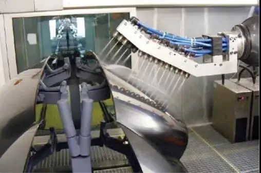 采用传统溶剂性涂料的机器人静电喷涂为内部充电方式,其涂料利用率可达90%以上。采用水性涂料外部充电方式的机器人静电喷涂,利用率约60%,且因为静电爪外伸造成污染较大,无法实施带电内喷(车身内表面喷涂)。如今,水性涂料内部充电方式(弹匣式或注射式,结构复杂)技术不断成熟,涂料利用率可达到70%,已经有实际使用案例,并可实现静电内喷。