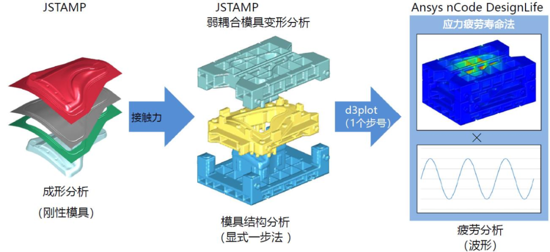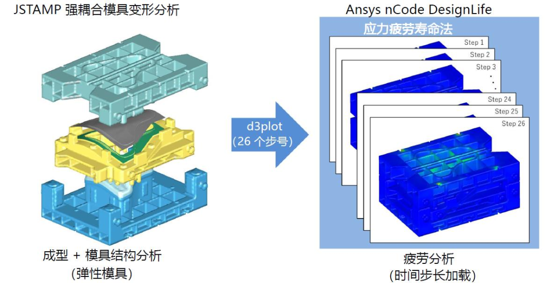 JSTAMP(冲压成型仿真系统)联合 Ansys nCode DesignLife(疲劳分析工具),提供从成型到疲劳的全流程分析,精准预测模具寿命,指导设计优化。