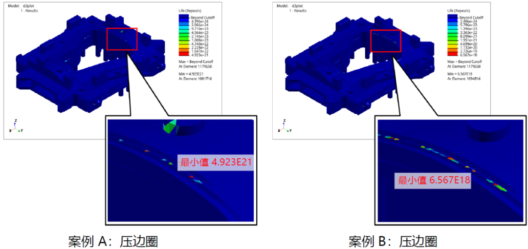 • 危险区域定位差异:Case A 可能遗漏动态载荷下的隐蔽薄弱点(如滑块约束部位)。