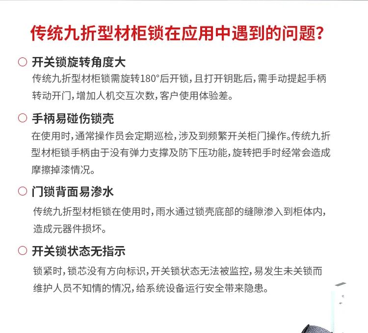 随着该产品40年的推广和发展,九折型材柜的应用场景也从数据中心延伸到工业PLC、工业电控等领域,使用环境也从室内转向室外,也这也对九折型材柜相关配套的锁闭系统造成了巨大挑战。