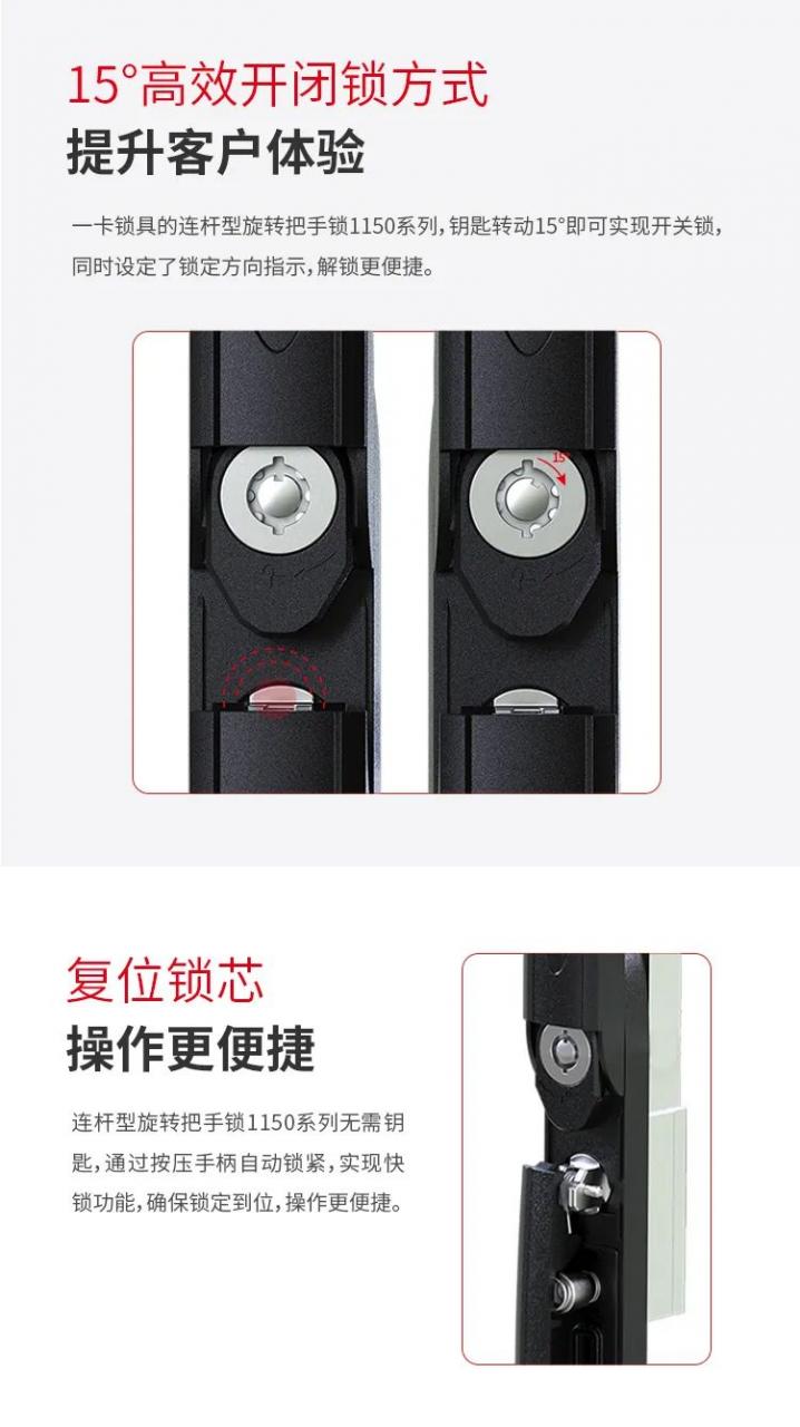 一卡锁具的连杆型旋转把手锁1150系列,钥匙转动15°即可实现开关锁,同时设定了锁定方向指示,解锁更便捷。