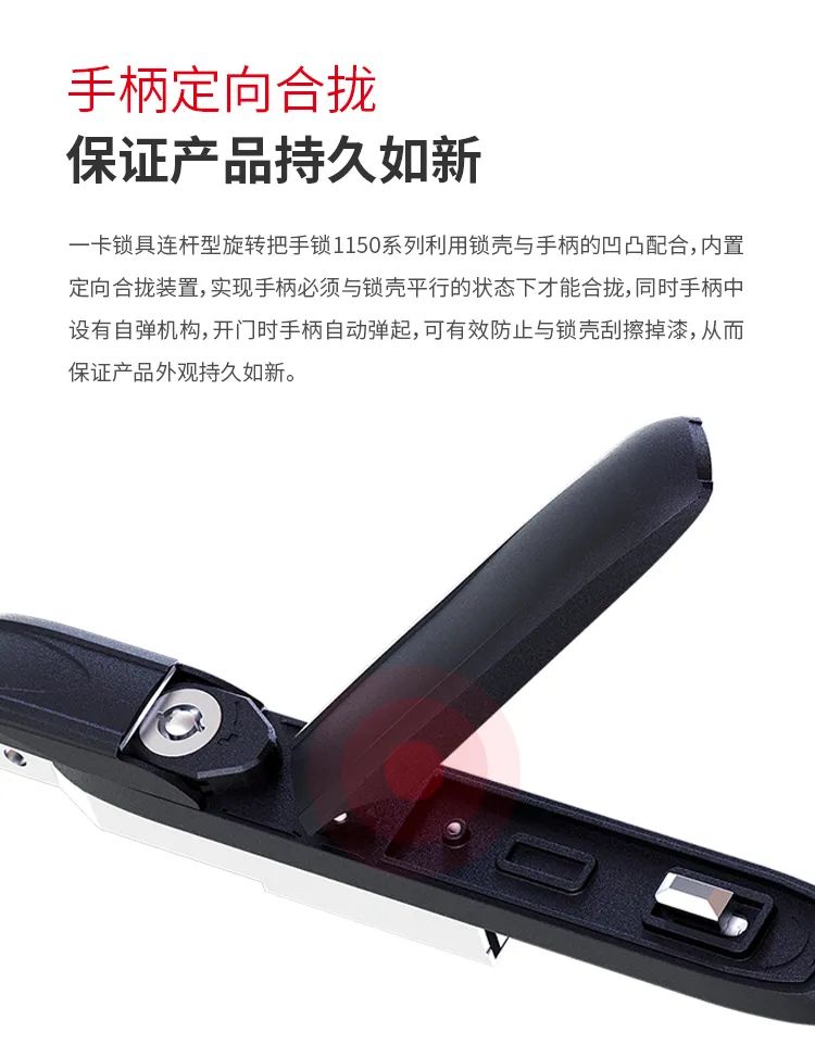 一卡锁具连杆型旋转把手锁1150系列利用锁壳与手柄的凹凸配合,内置定向合拢装置,实现手柄必须与锁壳平行的状态下才能合拢,同时手柄中设有自弹机构,开门时手柄自动弹起,可有效防止与锁壳刮擦掉漆,从而保证产品外观持久如新。
