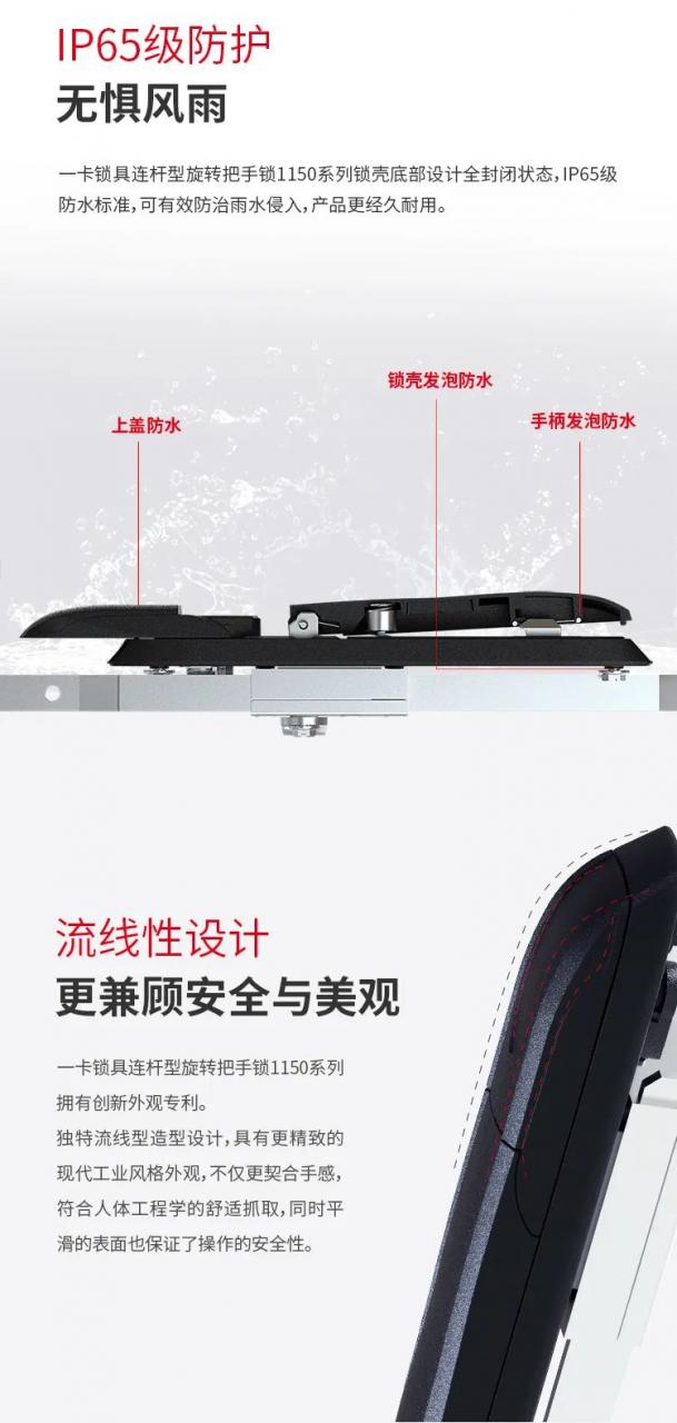 一卡锁具连杆型旋转把手锁1150系列锁壳底部设计全封闭状态,IP65级防水标准,可有效防止雨水侵入,产品更经久耐用。