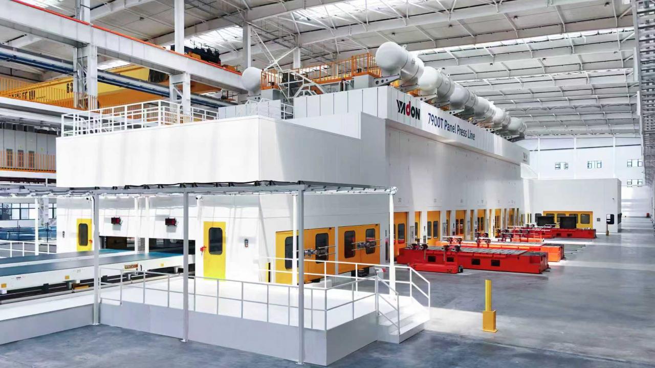 级进模冲压线和落料线:级进模压力机多面向厚板、大台面模具高频次冲压,扬锻级进模压力机偏心齿轮、多连杆、肘杆等结构满足多种冲压工艺需求,通过设计、制造等环节优化机身刚性经舒勒专用工装验证,优于1/10000挠度标准,大型压力机连续模冲压效率可达80次/分钟。800、1000T系列YB4E闭式四点高速落料压力机的生产效率65+次/分钟,满足主机厂多车型、多材质的高效率、高稳定性的柔性化生产,扬锻采用舒勒的技术,在过冲控制及震动影响采取优势的方案,能够有效应对,该技术领先于业内国内外同行。同时在落料线针对上下游材料转运、整厂设备对接自动化、智能化的实施上,扬锻可提供成熟、有效的整体解决方案。