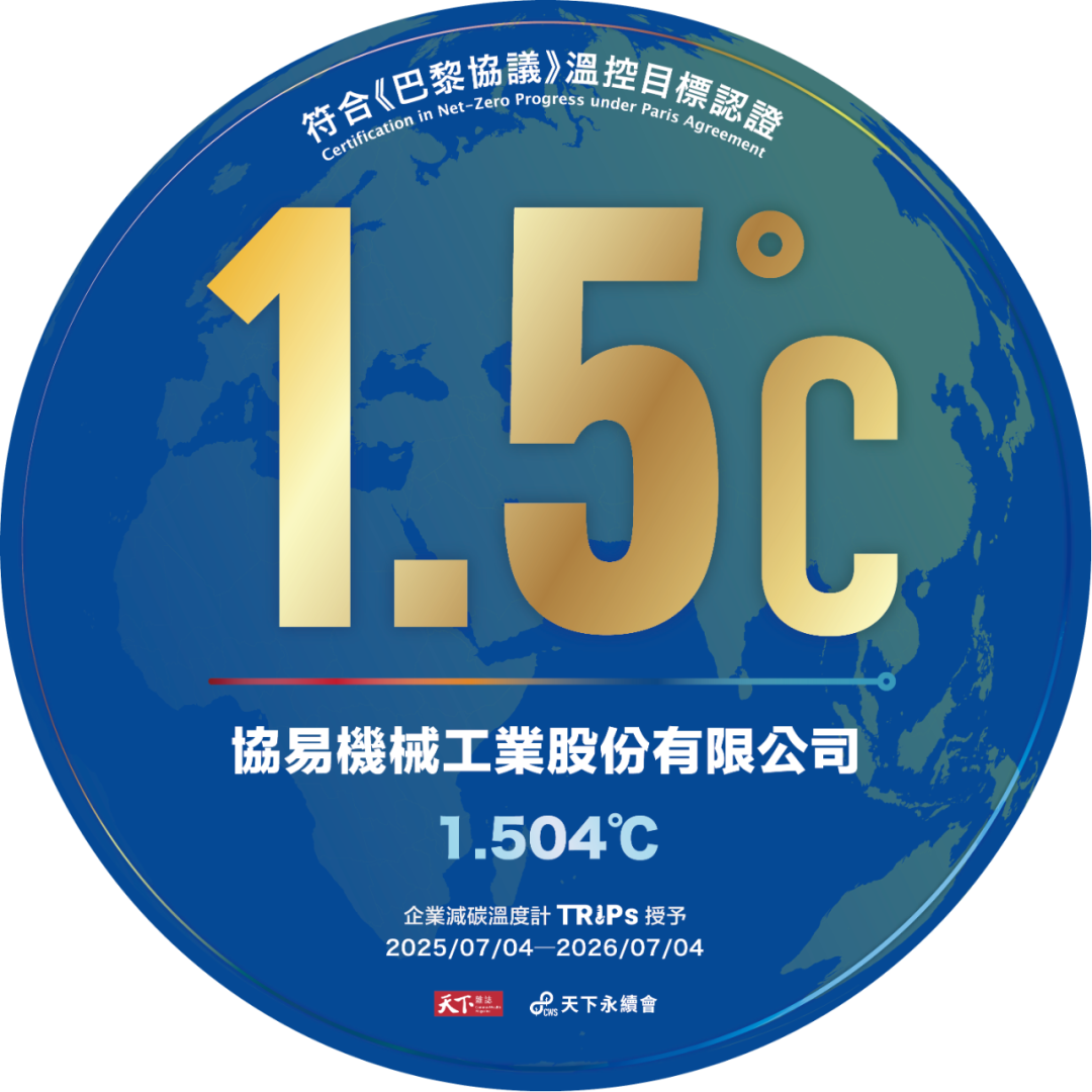 协易机械参与《天下杂志》与东海大学联合推动的「企业减碳温度计 TRIPs」项目,提交以台湾总部厂区为盘查范围的2022与2023年度碳排放数据。经专家团队科学计算,我们荣获「成效卓越」等级,对应升温值为 1.504°C,这一数值代表协易在温控减碳上的切实成果。