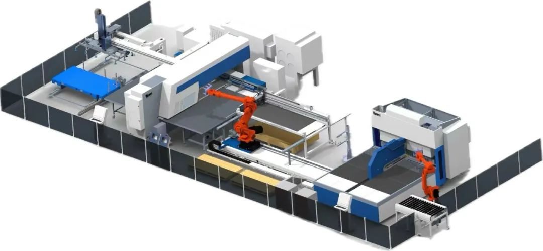 亚威AMS.HSLP-1530数控板料冲剪切割折弯自动化生产线为国内率先研发,产线以智能板料立体仓库为存储和物流中转枢纽,配套冲压、剪切、攻丝、成型、激光切割、分拣码垛、折弯、机器人下料堆垛、工序间自动物流周转等多种工艺设备。生产线由公司自主开发的智能柔性生产调度控制系统(MES)统一调度管理,各工艺设备集中控制平台(FMS总控)集中控制,实时监控获取设备数据状态,实现无人化值守全天候自动加工,适用于电力电气、电梯、厨卫、金属幕墙等大部分钣金加工行业。生产线集成了行业首创的高性能、3mm重载可自动换模板料四边折弯技术,以及大工位板料冲剪复合加工技术,系列化、模块化、可快速组合的物料流转、定位、翻面和分拣堆垛等自动化辅助技术,板材利用率高,加工产品精度高、无划伤、齐套性强,节能环保,实现了对国际同类产品的进口替代,有力提升国内钣金加工行业智能化水平。