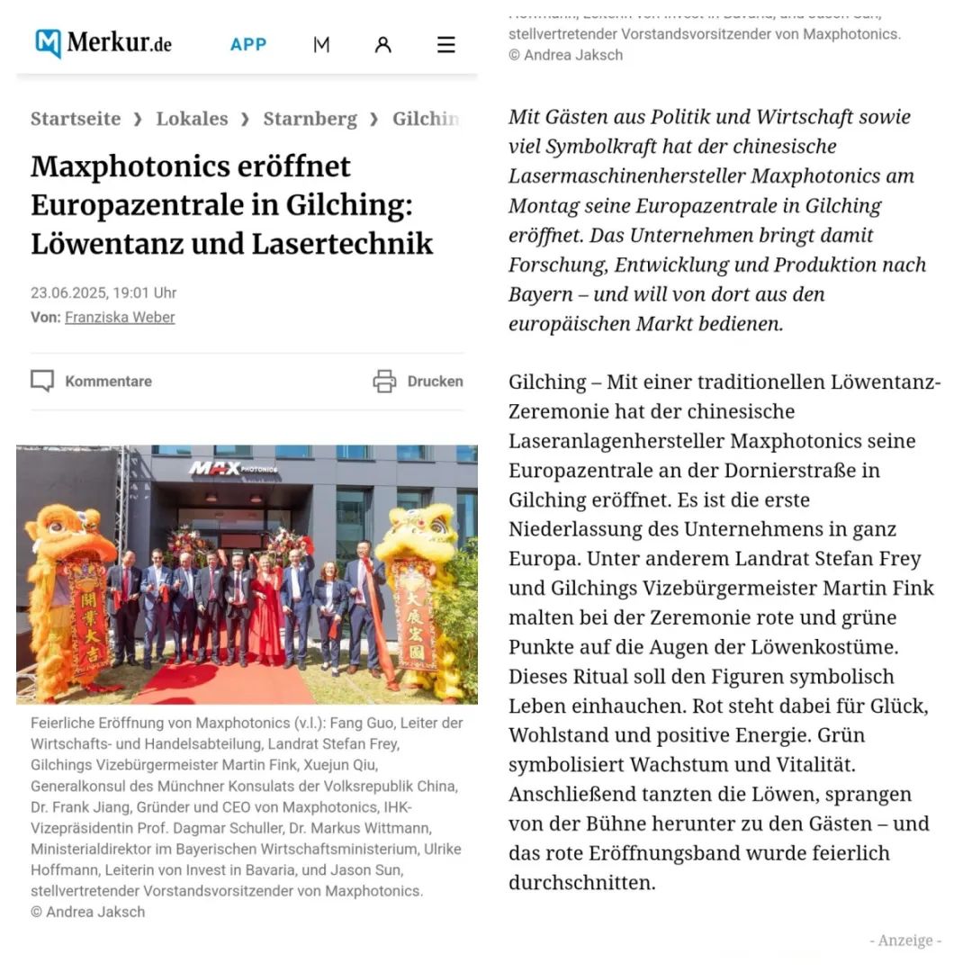 全新启用的欧洲总部及德国子公司坐落于欧洲领先的高端制造与激光技术中心——巴伐利亚州吉尔兴市(Gilching),附近拥有国际知名的锐镭、黑鸟、EOS、Alpha Laser总部、相干德国总部,具有德国最完善的激光产业链基础,紧邻知名的慕尼黑国际应用激光、光电技术博览会,该州具备优越的制造基础和高水平的激光工业生态。创鑫激光的加入,将与当地企业建立长期、稳定、互利共赢的协作伙伴关系,实现激光技术和应用互补与联合创新。