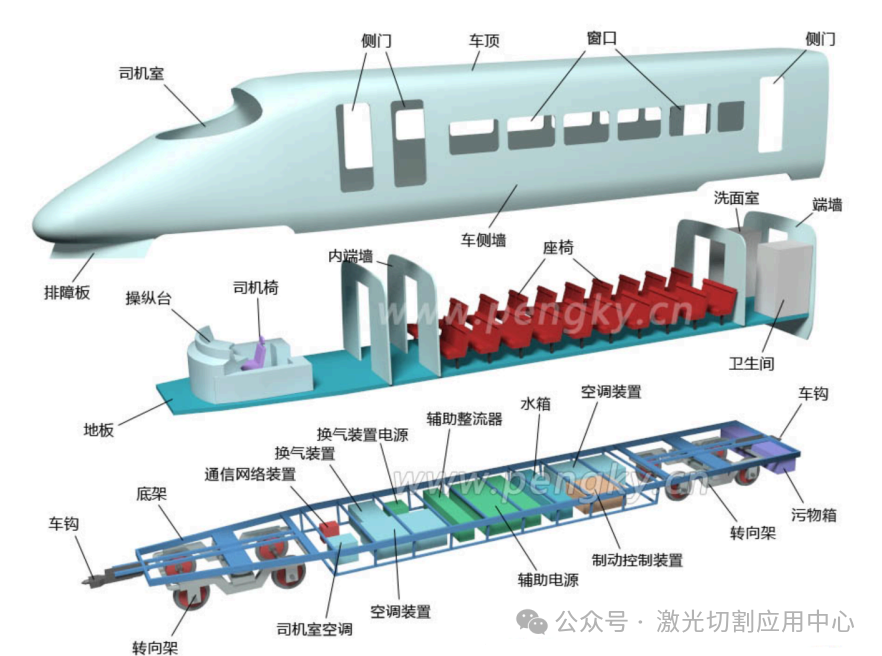 💡 技术亮点:高铁车体采用大型铝合金型材焊接而成,焊后变形控制难度大。三维五轴激光切割可实现整体加工,确保各部件之间的精确配合,同时大幅提高加工效率,将传统加工需要数小时的工序缩短至几十分钟。