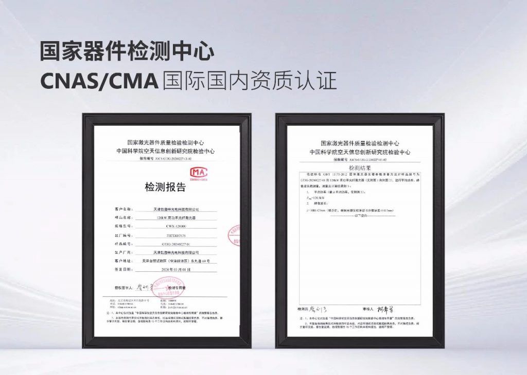 在光纤激光器领域,凯普林持续创新,接力突破,不断刷新激光器功率上限,助推激光行业迈向更高水准。作为今年的又一款重磅新品,雷霆120kW光纤激光器具备更先进的加工能力,且光束优质、性能稳定,堪称中国激光器工业领域的又一重要里程碑。一国家器件检测中心权威认证