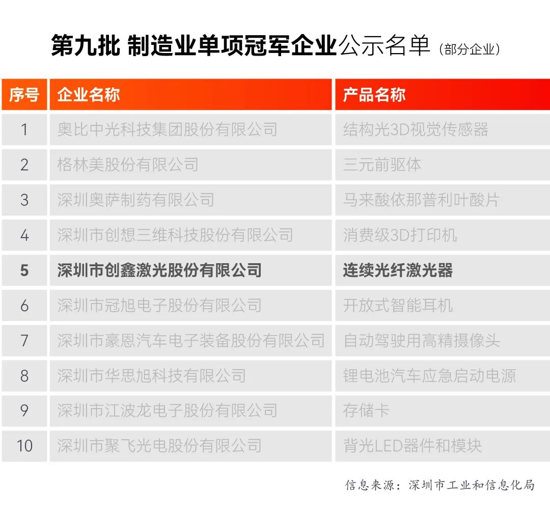 2025年,创鑫激光凭借在连续光纤激光器领域的卓越技术与全球市场的领先优势,成功入选国家级“制造业单项冠军企业”。这一荣誉是国家对创鑫激光在技术实力、市场地位与品牌价值方面的最高认可,标志着其在连续光纤激光器领域已代表中国制造的最高水准。