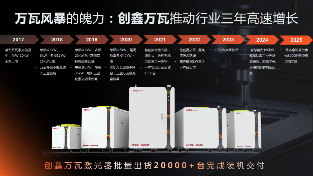 自成立以来,创鑫激光始终专注光纤激光器的研发与制造,并率先在业内实现核心器件与激光器的垂直整合。这一战略不仅保障了供应链自主可控与产品高可靠性,更通过技术协同持续优化性能与成本,有力提升了国产光纤激光器的全球竞争力,成功打破高功率光纤激光器长期被国外垄断的局面。如今,创鑫激光已在工业级超高功率光纤激光器领域跻身全球领先阵营,实现从追赶到领跑的历史性跨越。