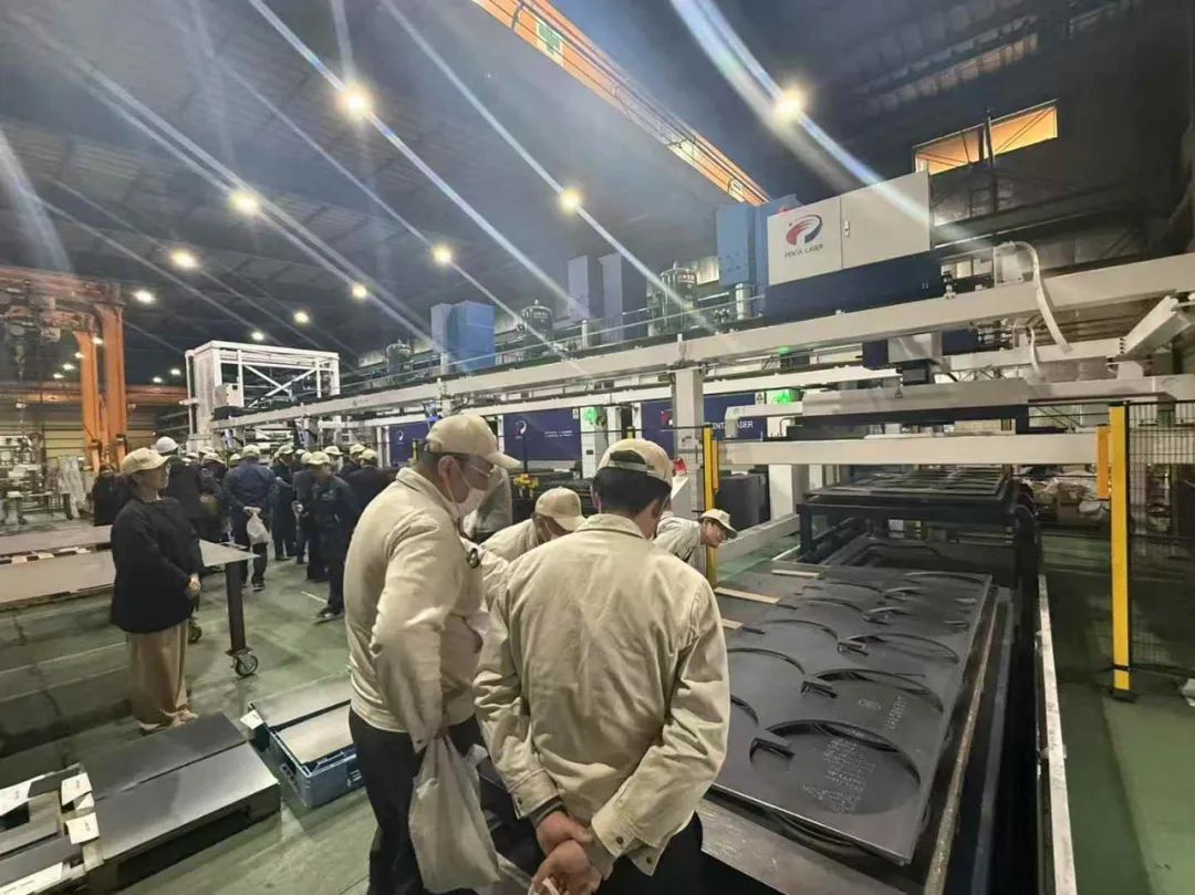 该发布会在日本大松机械公司举行。该公司是一家大型机械零部件制造公司,拥有8台通快激光切割机和6台奔腾激光切割机。今年初安装了一套奔腾激光研发设计的一拖三(12kw激光)全自动化切割下料产线,每天24小时连续运行了2个月时间。其性能稳定,客户生产效率得到极大提升。参会人员兴致勃勃地参观了这条自动化产线的生产演示,给予了高度评价。