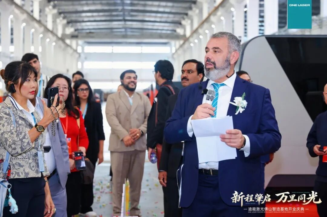 迪能激光欧洲销售总监Luigi在新品发布现场介绍D-Speed高性能激光切割机