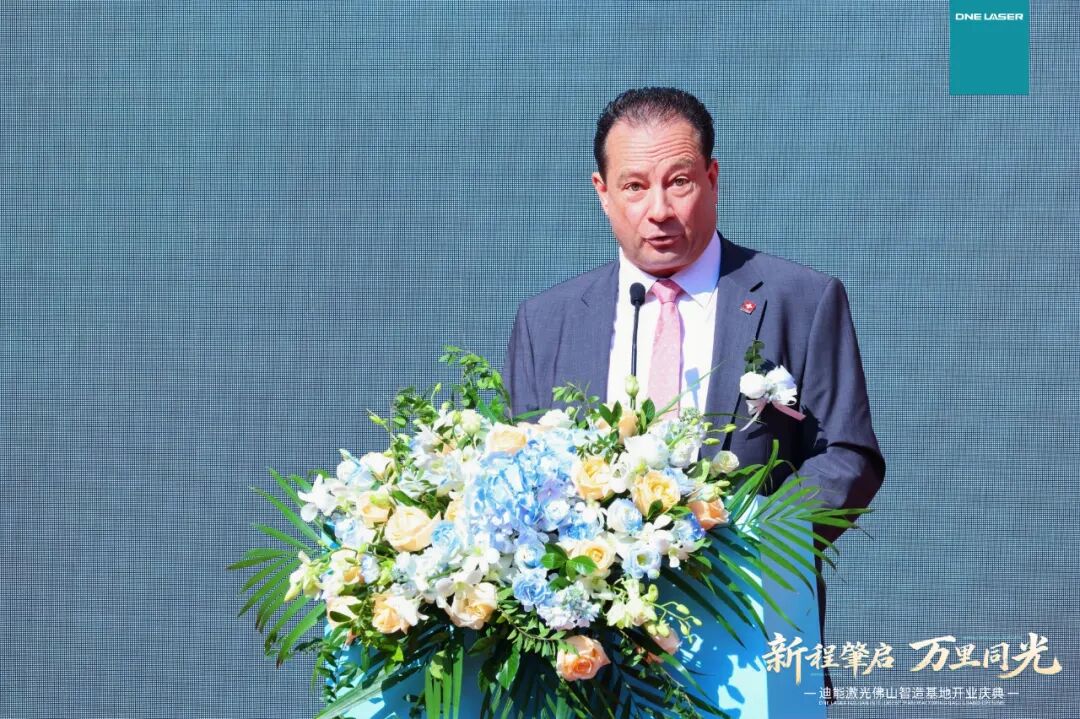 瑞士驻广州总领事Mr.Markus Thür,佛山市南海区人大常委会党组书记、主任陈浩斌先生,瑞士百超集团总裁Domenico先生,瑞士百超集团中国区及亚太区总裁、迪能激光全球CEO游松博士,以及行业合作伙伴、国内外客户代表近300人齐聚一堂,共同见证了这一激光装备产业的重要里程碑,活动全程洋溢着政企携手、共启新篇的热烈氛围。