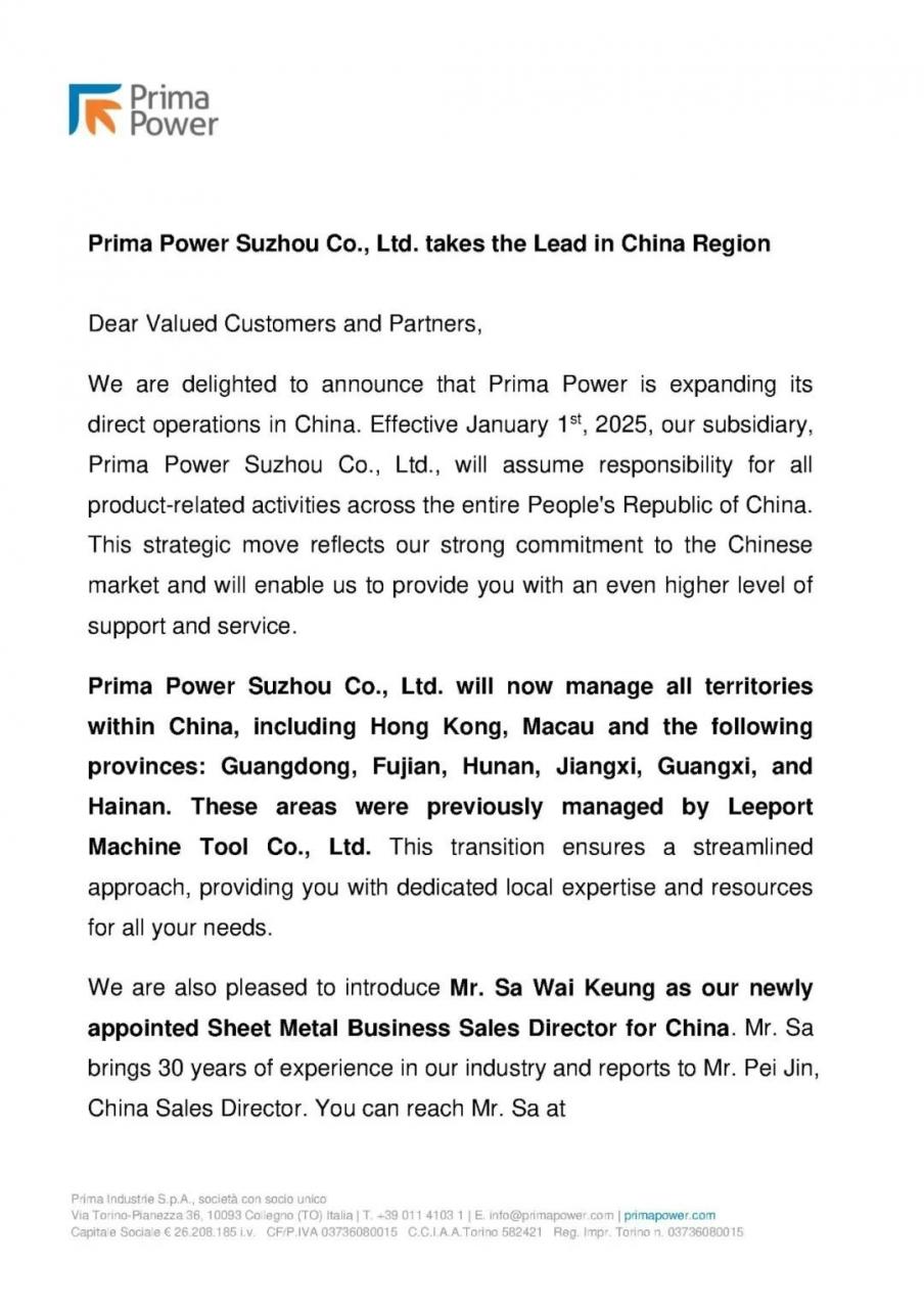 普玛宝钣金设备(苏州)有限公司全面主导中国区业务