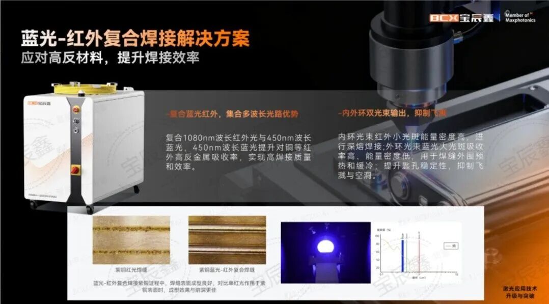 蓝光-红外复合焊接:针对铜、铝等高反材料,创新性地将450nm蓝光(高吸收率)与1080nm红外光(高穿透力) 复合。蓝光在外环预热并提升材料对红外光的吸收效率,内环红外光进行深熔焊,从根本上解决了高反材料的焊接稳定性与飞溅难题。
