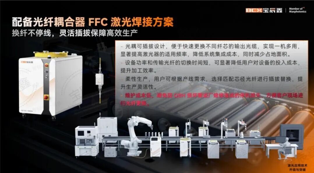 模块化设计:光纤耦合器(FFC) 的引入,允许用户在生产线上快速更换不同芯径的光纤,实现了功率的柔性分配,极大提升了设备利用率和生产灵活性。降低维护成本,避免因 QBH 损坏需返厂维修造成的停机损失,方便客户现场进行光纤更换。