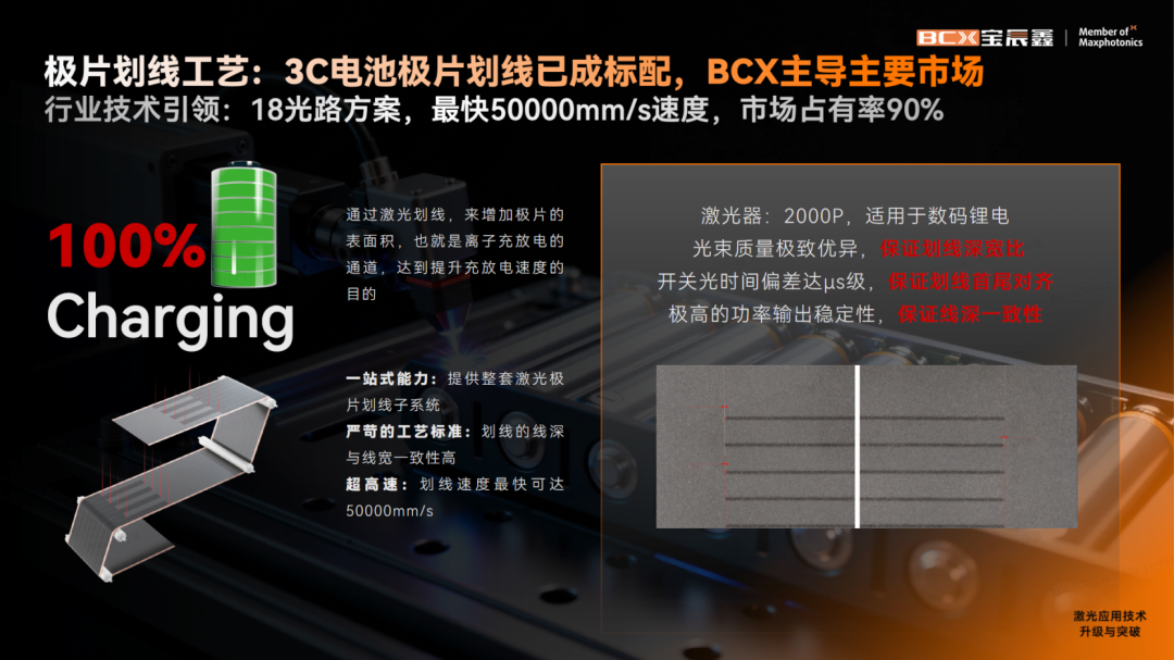 针对极片划线工艺,宝辰鑫凭借18光路方案、50000mm/s超高划线速度以及行业领先的工艺一致性,在3C电池市场占有率超过90%,并已推出适用于动力与储能电池的新一代划线系统,满足更深、更快、更稳定的工艺需求。