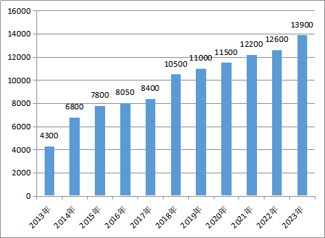 图32013~2023年全国铁路基本建设投资及预测图(单位:亿元)
