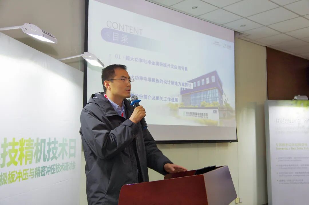 柳玉起教授围绕金属双极板与散热片精密成形及仿真技术作专题报告,核心是通过数值模拟与有限元分析,优化冲压工艺参数与模具结构,以虚拟试错降低研发成本,加速设计到量产落地。在双极板领域,重点解决 0.075–0.1mm 超薄金属微细成形易开裂、起皱问题,支撑流道周期从 2.0mm 迭代至 1.4mm 以下,保障大功率燃料电池双极板规模化稳定生产。在散热片领域,通过成形极限、应力分布及回弹补偿模拟,优化板料与模具匹配性,实现高精密、高一致性高速冲压,为热管理组件高效制造奠定基础。杨正钰博士:双极板精密成形制程与伺服工艺验证。