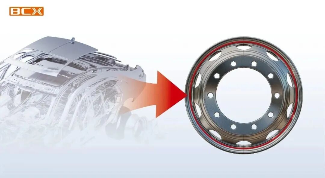 ↑ 轮辋(外圈)与轮辐(中心盘状结构)这两个部分通过一条360°的环形焊缝焊接在一起。