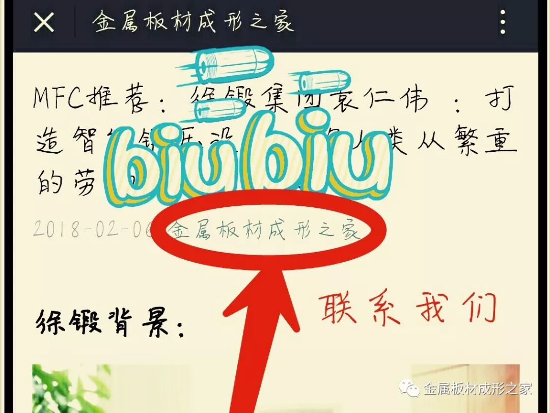 《金属板材成形》是 MFC金属板材成形咨询(北京)有限公司打造的新型综合媒体平台,旗下有金属板材成形”服务号、“金属板材成形之家@今日头条”、《中国金属板材成形网》、MFC-冲压联盟名家直播(千聊平台)、MFC1.6万人群友通讯录,以及在百度百家、腾讯、搜狐、知乎等平台开设的原创资讯账号。
