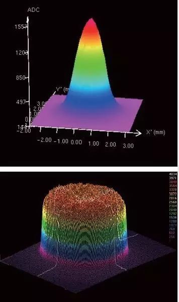 图2:单模光纤激光束形状(上图) 多模平顶激光束形状(下图)